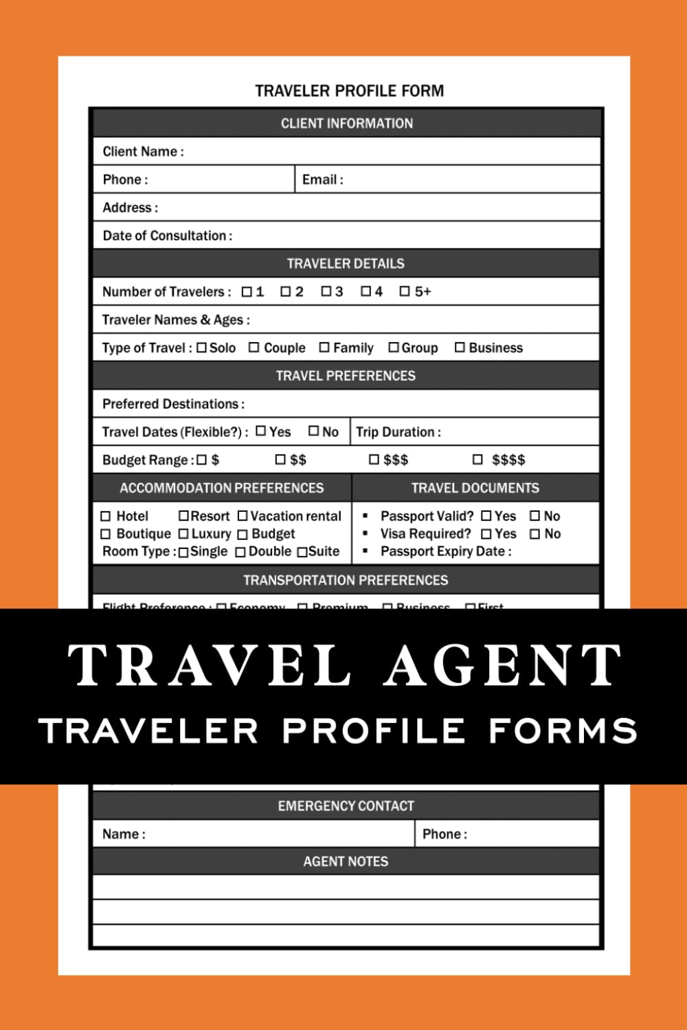Whether you’re organizing a luxury getaway, family vacation, honeymoon, or corporate trip, this traveler profile form book helps you deliver better planning, better service, and better trips. Get this book now!