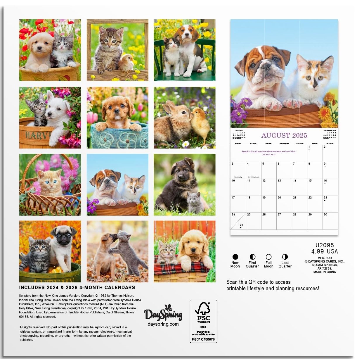 Product Features:Plan your whole year beginning January 2025 – December 2025 with this compact 7 x 7 inch mini wall calendar printed on quality paper to minimize bleed through. Perfect for small spaces or to take with you on-the-go.Be inspired by uplifting Scripture on each monthly spread alongside sweet photography of puppies and kittens.Includes a QR code to access lifestyle and planning resources like habit tracking, meal planning, to-do lists, and more.Each monthly grid provides ample writing space so you can keep track of all of life’s important events, reminders, appointments, or birthdays. There is blank space at the bottom of each month for any additional notes, lists, or to dos.Features national holidays, previous and next month reference calendars for easy planning. Also, includes a 2024 and 2026 4-month calendar for quick reference.