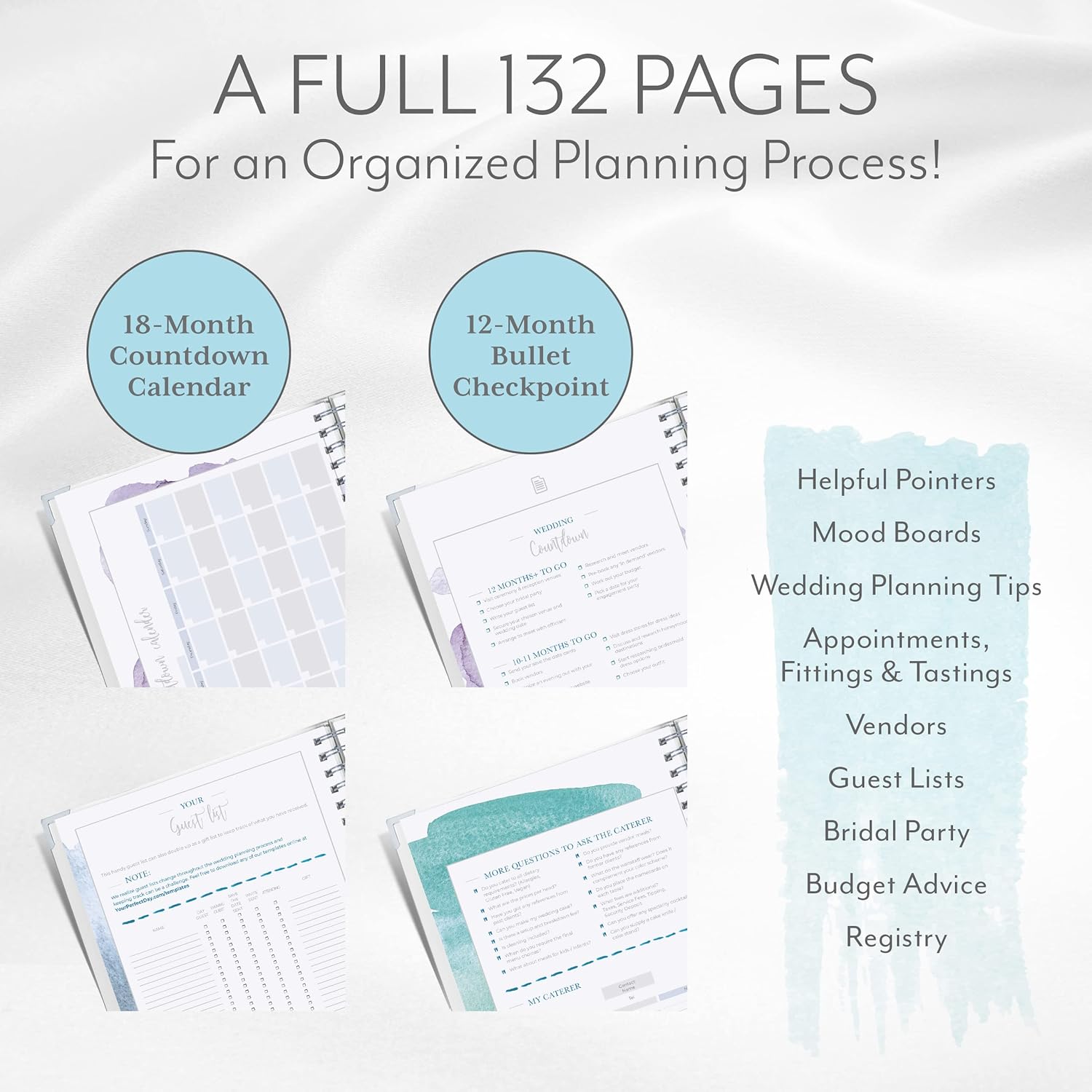 Countdown Calendar – The 18-month countdown calendar helps you organize your days, and the 12-month bullet point checklist ensures nothing gets missed. Keep track of appointments, trials, fittings, vendors, food tastings and more.